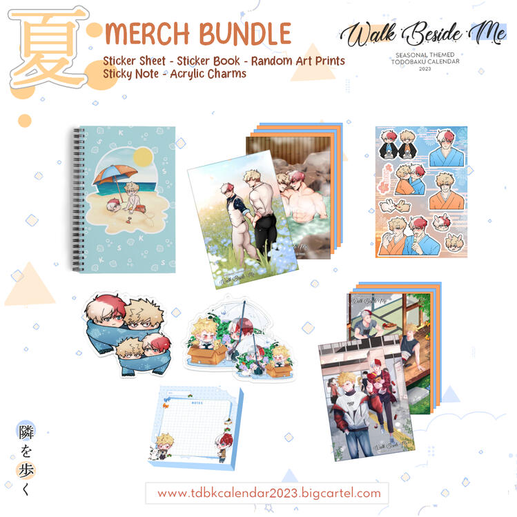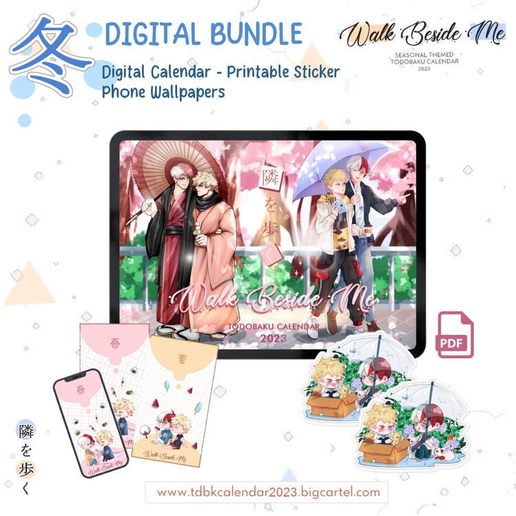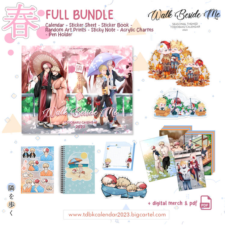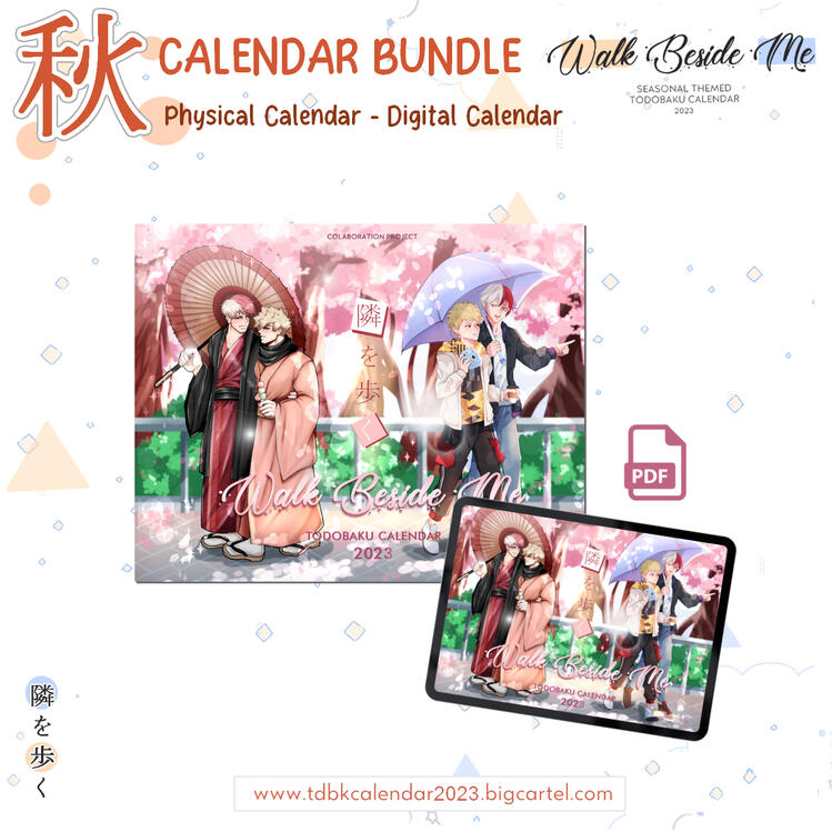"Walk Beside Me" is a 2023 calendar project featuring adult (18+) Todoroki Shoto and Bakugo Katsuki's domestic life as a couple throughout the seasons! The calendar will feature 12 pages with full illustrations and include matching merchandise.